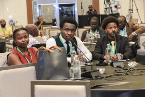 Peter Gondo (with a microphone) a consultant at SKYPEG Consulting Ltd, speaking during a discussion session at